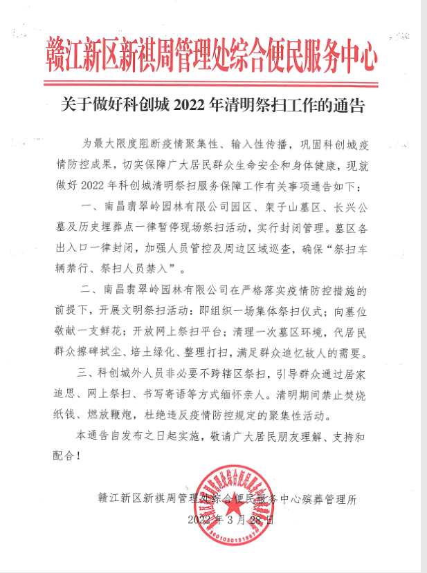 接《赣江新区新祺周管理处综合便民服务中心殡葬管理所》通知,南昌翡翠园关于做好科创城2022年清明祭扫工作的通告如下: